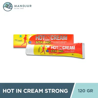 Hot In Cream Strong merupakan obat yang digunakan secara topikal yang berkhasiat dalam meredakan pegal-pegal, nyeri otot dan sendi akibat trauma (memar dan keseleo) ataupun nyeri otot pada punggung. Kandungan menthol dapat memberikan sensasi dingin dan kemudian hangat ketika diaplikasikan pada kulit, hal tersebut dapat mengalihkan rasa nyeri yang dirasakan dan memberikan efek analgetik alami, minyak gandapura yang mampu mengurangi rasa pegal-pegal, encok, keseleo dan memulihkan tubuh dari rasa capek. Minyak Kayu Putih (Oleum Eucalyptus) yang terkandung dalam krim atau salep dapat digunakan untuk meredakan rasa sakit pada kondisi rheumatoid arthritis dan osteoarthritis. Selain ini minyak ini dapat menghangatkan badan.
