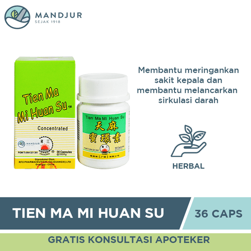 Perdana Sakti IndonesiaTien Ma Mi Huan Su merupakan herbal yang dapat membantu meringankan sakit kepala dan membantu melancarkan sirkulasi darah. Indikasi Mengobati Vert...