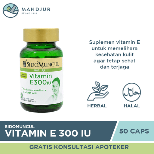 SidomunculSido Muncul Natural Vitamin E 300 IU merupakan suplemen Vitamin E alami 300 IU yang berasal dari minyak biji gandum dan biji bunga matahari. Suplem...