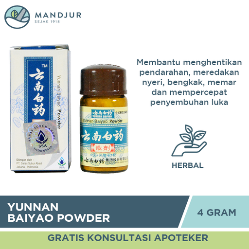 Saras Subur AbadiYunnan Baiyao Powder (Bubuk) merupakan obat herbal China yang memiliki khasiat serta kandungan sama seperti Yunnan Baiyao Kapsul, yaitu dapat memba...