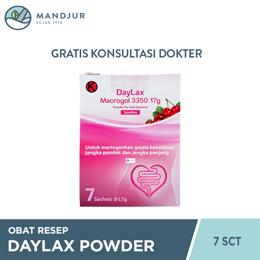 PT Meiji Indonesian Pharmaceutical IndustriesFARMAKOLOGIDayLax mengandung zat aktif Macrogol 3350 Powder. Macrogol 3350 merupakan golongan osmotik laksatif dengan mekanisme kerja meningkatkan ...