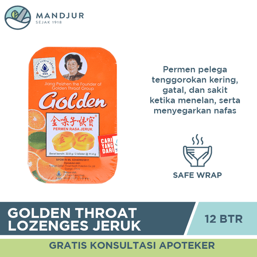 Golden Throat Lozenge Jeruk merupakan permen pelega tenggorokan yang berkhasiat untuk membantu mengurangi rasa tidak nyaman pada tenggorokan sepert...