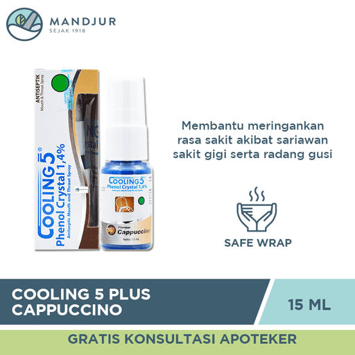 Cooling 5 Spray Cappuccino?merupakan obat semprot antiseptik dan anastetik mulut dan tenggorokan yang efektif dan aman serta dapat digunakan oleh s...