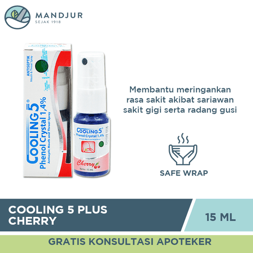 Cooling 5 Spray Cherry merupakan obat semprot antiseptik dan anastetik mulut dan tenggorokan yang efektif dan aman serta dapat digunakan oleh selur...