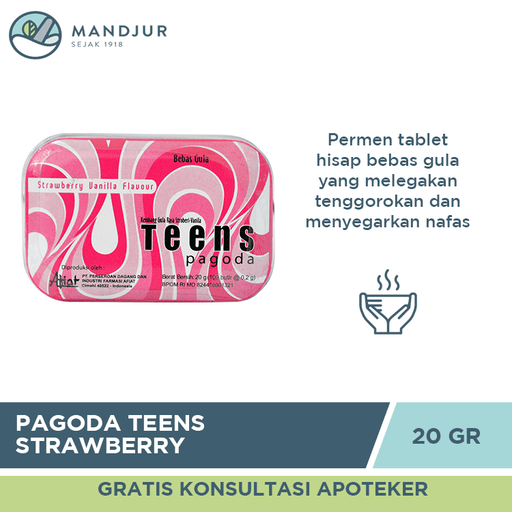 Pagoda Teens merupakan permen tablet hisap yang diformulasikan dengan rasa strawberry vanilla yang disukai kalangan remaja. Pagoda Teens ini permen...