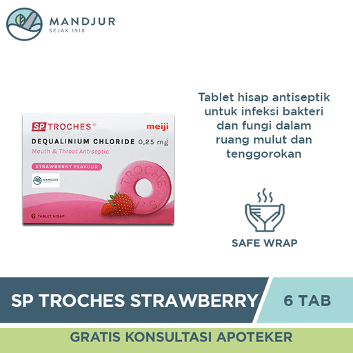SP Troches Meiji (rasa strawberry) merupakan tablet hisap yang mengandung zat berkhasiat Dequalinium Klorida dengan pengisi, pengikat dan pelumas y...