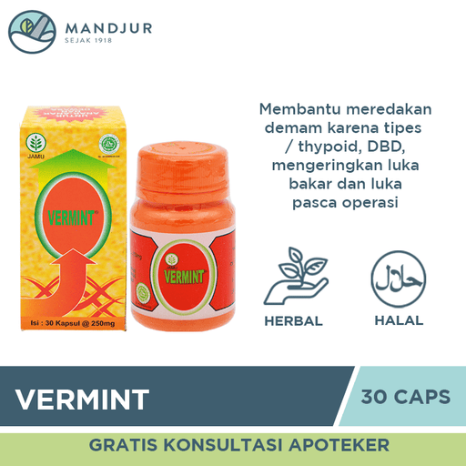 Vermint merupakan obat herbal yang mengandung ekstrak Lumbricus Rubellus (Cacing Tanah Merah) untuk membantu meredakan demam. Biasanya digunakan un...