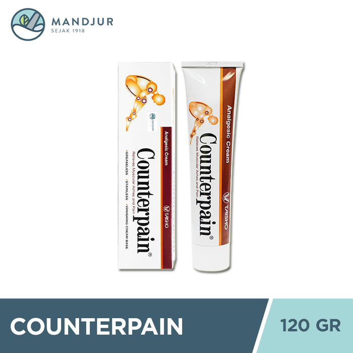 Counterpain merupakan krim analgesik yang berkhasiat membantu meredakan nyeri otot, nyeri sendi, otot keseleo, dan sakit pinggang / encok. krim analgesik ini hanya digunakan untuk pemakaian luar saja pada bagian yang terasa sakit.?