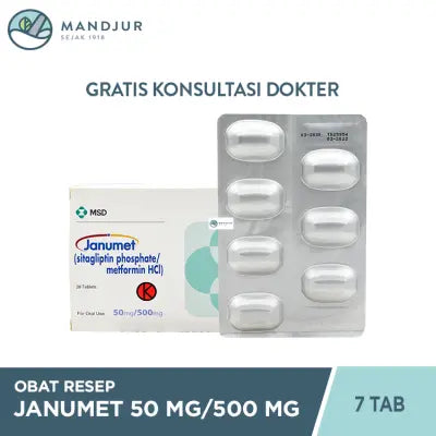 Cara Pakai : Sehari dua kali setelah makan dengan dosis 50 mg sitagliptin/500mg metformin KhasiatJanumet 50 Mg/500 Mg berkhasiat untuk menurunkan gula darah pada orang dewasa dengan diabetes tipe 2Laranganginjal intrinsik & hipoperfusi ginjal, penyakit jantung, hindari konsumsi alkohol secara berlebihan, penggunaan bersama obat hipoglikemia atau obat yg mempengaruhi fungsi ginjal, hamil & laktasi