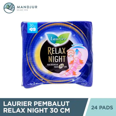 Laurier Relax Night Wing 30cm adalah pembalut wanita malam hari dengan panjang 30 cm yang memberikan perlindungan tidur bebas bocor selama 10 jam. Bagian tengah pembalut mengunci cairan dan gumpalan dengan maksimal. Serap banyak dan cepat sepanjang malam. Memiliki struktur bebas celah dan wing sehingga bebas bocor karena tidak geser dan darah tidak menyebar di permukaan.