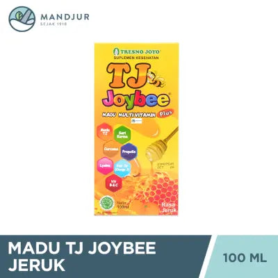 Madu TJ Joybee Jeruk merupakan kombinasi madu dan multivitamin pertama di Indonesia. Suplemen ini mengandung berbagai herbal alami seperti : Curcuma, Madu, Propolis, Sari Kurma dan Multivitamin : Vitamin B kompleks, vitamin C, Lysine, EPA, DHA. Perpaduan madu dan multivitamin memberikan manfaat lengkap untuk pertumbuhan anak. TJ Joybee membantu memperbaiki nafsu makan, meningkatkan daya tahan tubuh anak, mencegah sariawan dan panas dalam, membantu mengoptimalkan fungsi otak serta membantu pertumbuhan dan perkembangan anak. Tersedia 3 varian rasa TJ Joybee : Jeruk, Madu (original), dan Strawberry.