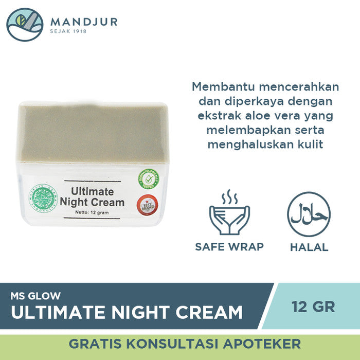MS Glow Ultimate Night Cream merupakan krim wajah khusus malam hari dengan formula bahan aktif yang dapat membantu mencerahkan, meregenerasi dan memudarkan flek/noda wajah, mengandung kombinasi Kojic Acid, Arbutin, dan Vitamin A & C. Cocok digunakan sebagai produk anti-aging.