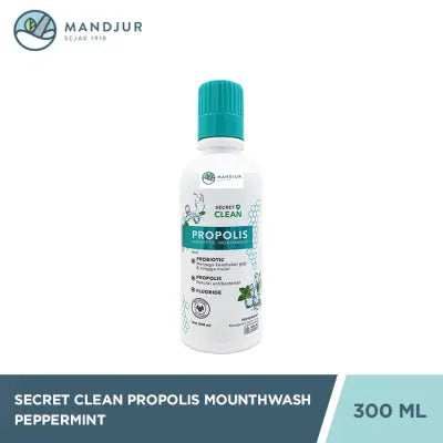 Secret Clean Propolis Antiseptic Mouthwash Peppermint merupakan obat kumur antiseptik untuk menjaga kesehatan gigi dan rongga mulut. Menyikat gigi saja hanya membersihkan 25% bagian dari rongga mulut, untuk itu Secret Clean Propolis Antiseptic Mouthwash akan membantu Anda dalam membantu membersihkan gigi dan rongga mulut secara optimal. Mengandung probiotic dan fluoride yang membantu dalam menjaga kesehatan gigi dan rongga mulut serta mengandung natural antibakterial yang melindungi dari gangguan bakteri penyebab masalah mulut.