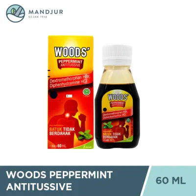 Woods Peppermint Antitussive merupakan sirup obat batuk yang dapat membantu meredakan batuk berdahak yang disertai alergi. Woods Peppermint Antitussive mengandung kombinasi yang bekerja menekan saraf pusat batuk dan mencegah alergi pada saluran pernapasan.
